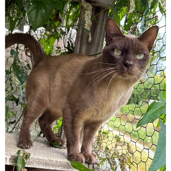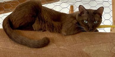 Choco is from Thailand and we are waiting to get his genetic tests back. It appears like he is a champagne Burmese but he totally lacks points we will soon know. He is the nicest cat in the world. He just loves to be held and hugged all the time. He is a little bit adventurous. Though he has a house, girl friends, children to tend and a yard, he is always trying to escape when I go in to see him. He is clearly interested in what the outside world has to offer. In this case, it would be wolves, foxes, and coyotes. None of which would want to be his friend.