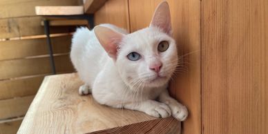 Violet is a very beautiful blue-blue-eyed cat. She and her friend, Lilac, are quite the team. She is the relaxed one with the Olympic purring skill and her roommate is the athlete. She walks over to Lilac and licks her ears and is the portrait of a mother cat. Everything, in her mind, is a baby and needs to be cleaned and watched over. Great cat.
