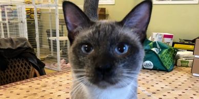 Estelle is a purr machine, literally. She doesn't even wait to be picked up. When she sees you, she starts purring and continues until you pick her up. It's probably manipulation on her part. I keep telling her that she should wait to purr until contact has been made with the person, but she has not taken this advice. She sees, she purrs, she conquers. She is quietly the boss of the pride, letting the others know she is in charge with the occasional light smack on their face. She is half Thai and half American Burmese. She is also the mother of the year. She loves having babies and being pregnant. So much so, I had to put her on vacation as she has no off button when it comes to having babies.