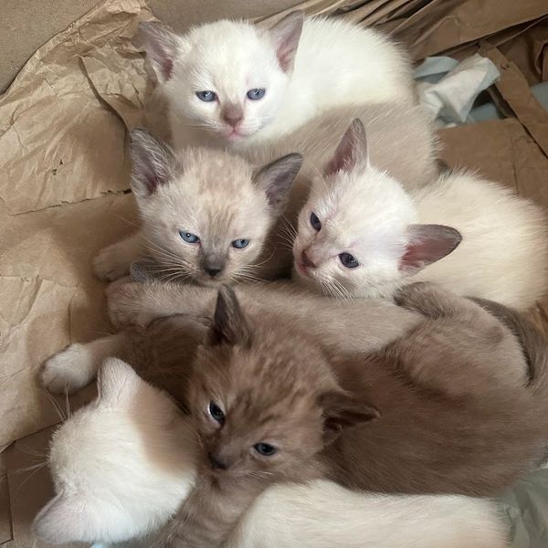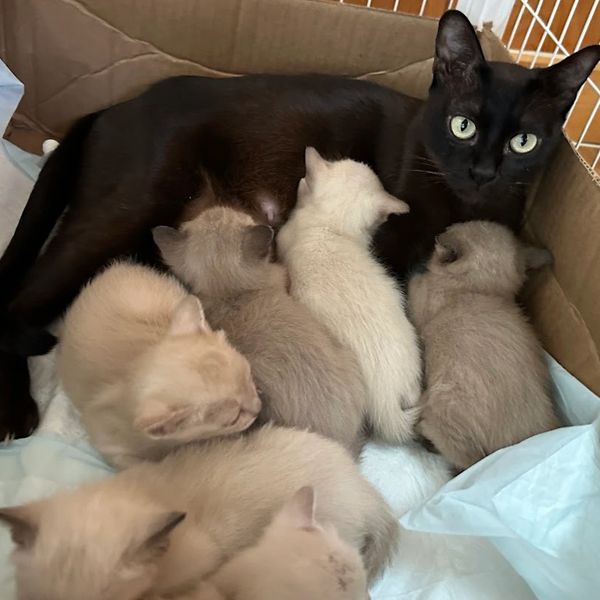 Haile is our elegant Sable mom shown here with two of her kittens from spring of 2025 Pansy our Blue Bangkok Mocha mama on the right.